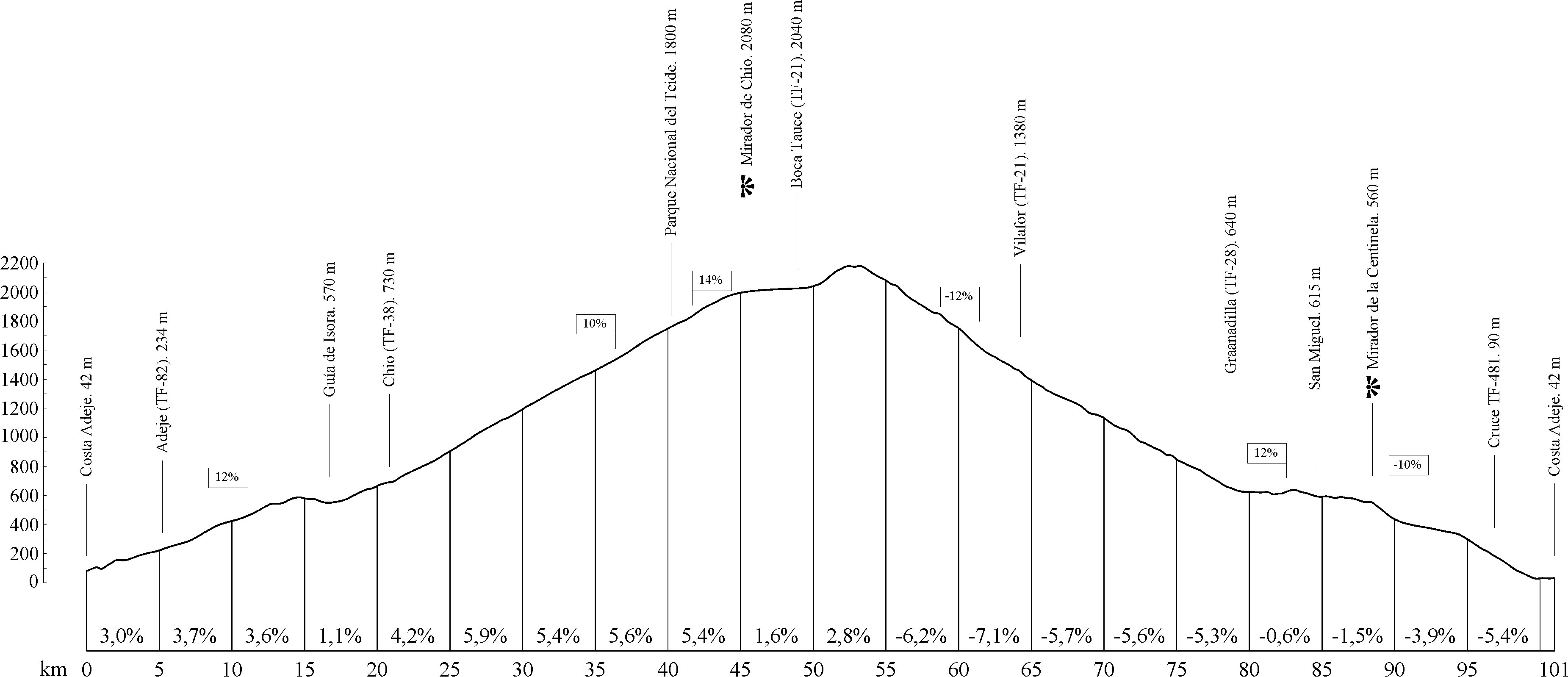 5 Kilometer weiter befindet sich der Mirador de Chío, ein Aussichtpunkt, an dem Sie den majestätischen Pico Viejo sehen können. In diesem Abschnitt verringert sich die Steigung soweit, dass die Straße mitunter eben ist und es ab und zu sogar ein Gefälle gibt. Bei Kilometer 48,6 befindet sich ein weiterer wichtiger Punkt auf der Route: Boca Tauce, eine Straßenkreuzung, wo Sie rechts in die Landstraße TF-21 in Richtung Vilaflor und Granadilla abbiegen müssen. Nun beginnt eine durchgängige Abfahrt bis zum Zielpunkt der Route mit Gefällen von bis zu 11 %. Auf diesem Streckenabschnitt können Sie an zahlreichen Punkten fantastische Ausblicke genießen.