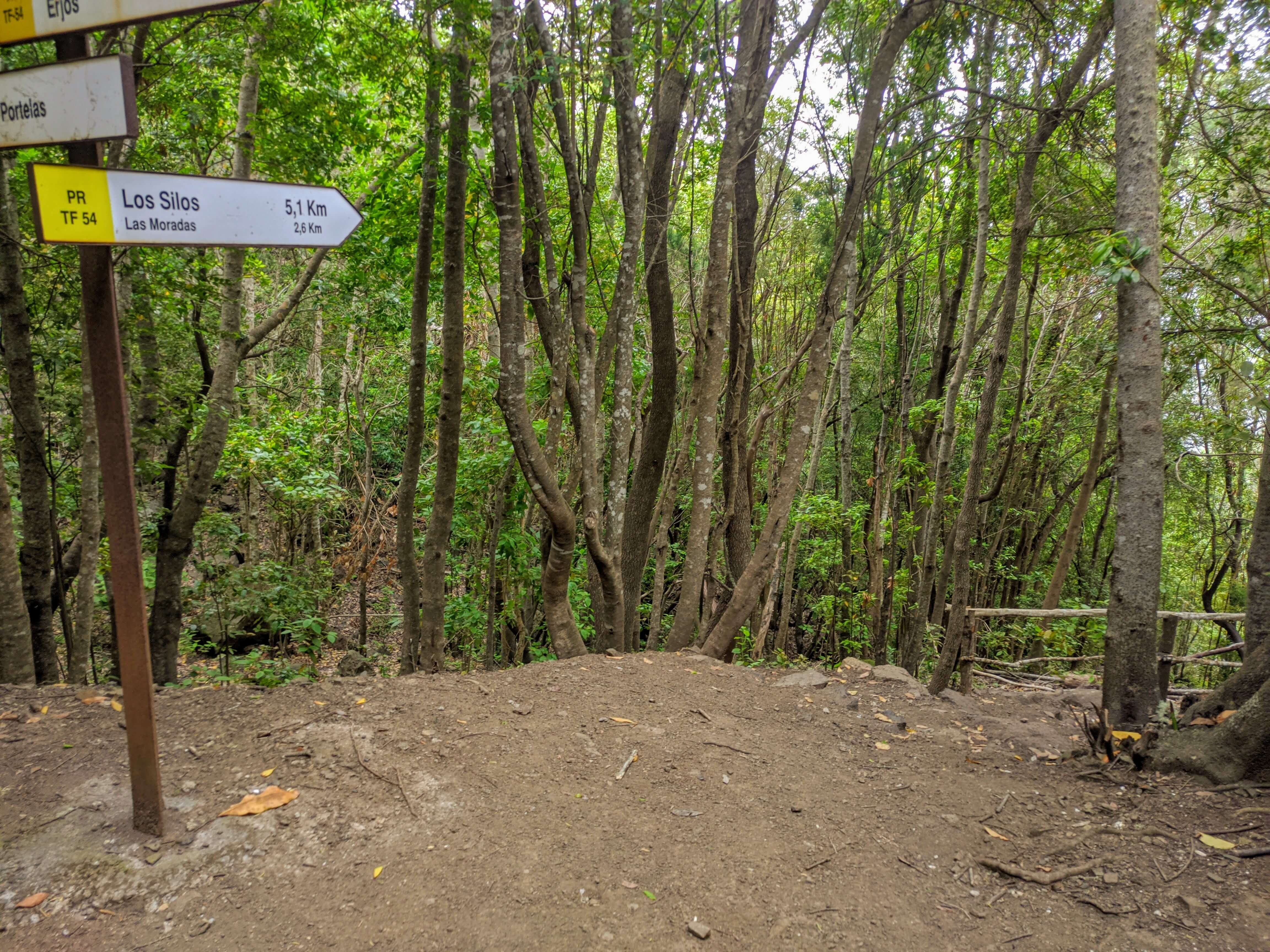 - Km 5,2 Nachdem wir einige Häuser hinter uns gelassen haben, stoßen wir auf einen unbefestigten Weg und folgen den Schildern nach rechts, die mit "Las Portelas", PR 52/54, beschildert sind. Von hier aus folgt man der PR 52 Las Portelas und läuft dann bergab auf der PR 54 Las Moradas. Der Weg steigt nun ein wenig an, um auf den Weg zum Montaña del Agua – Berg zu stoßen.