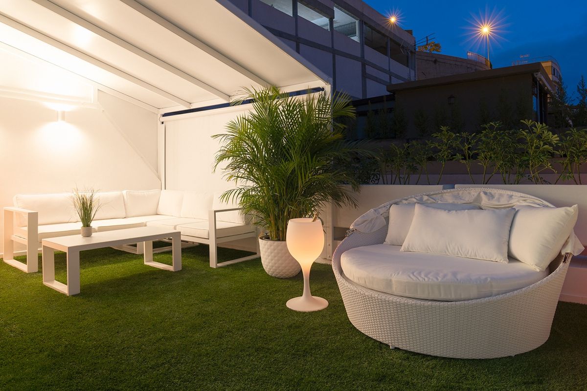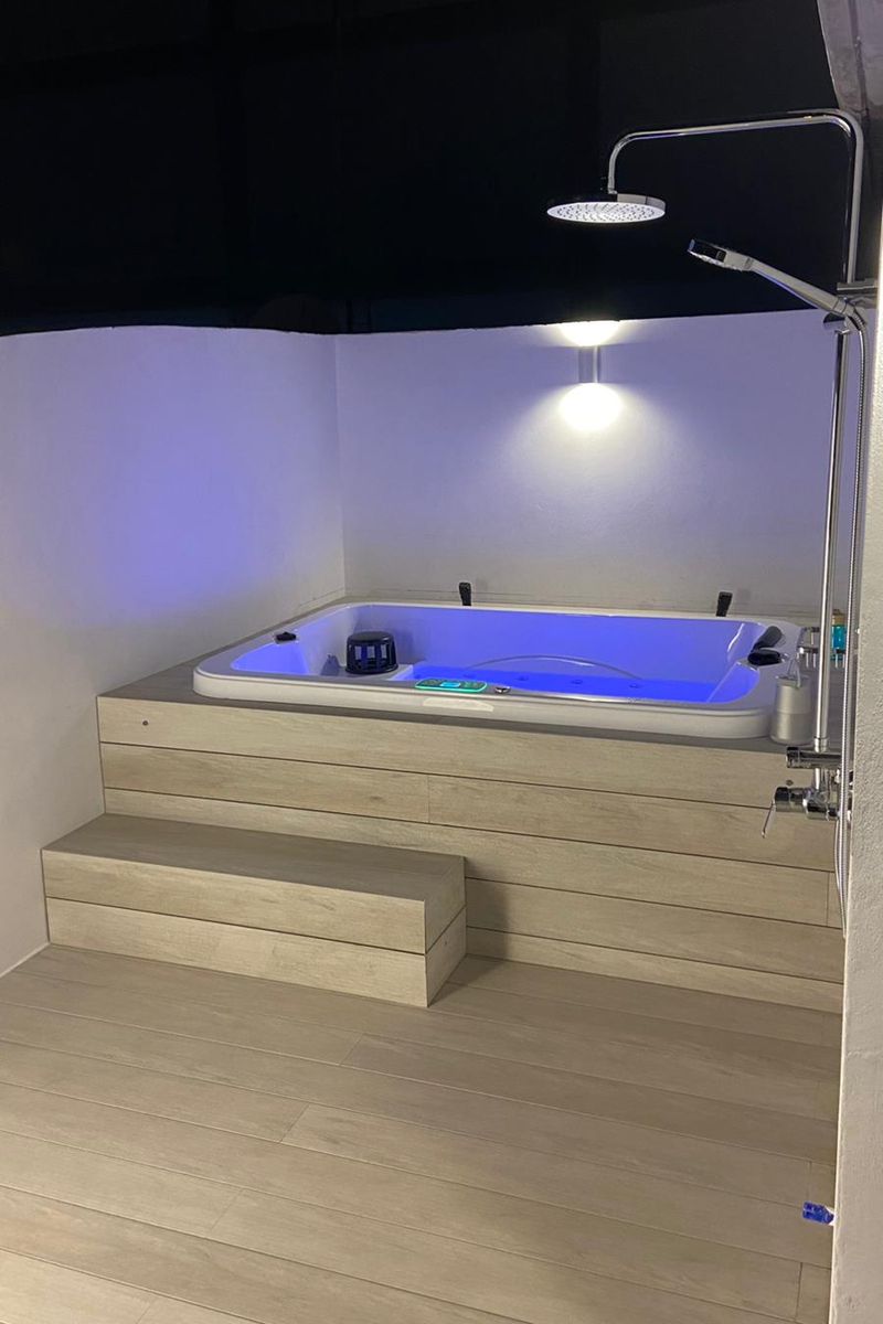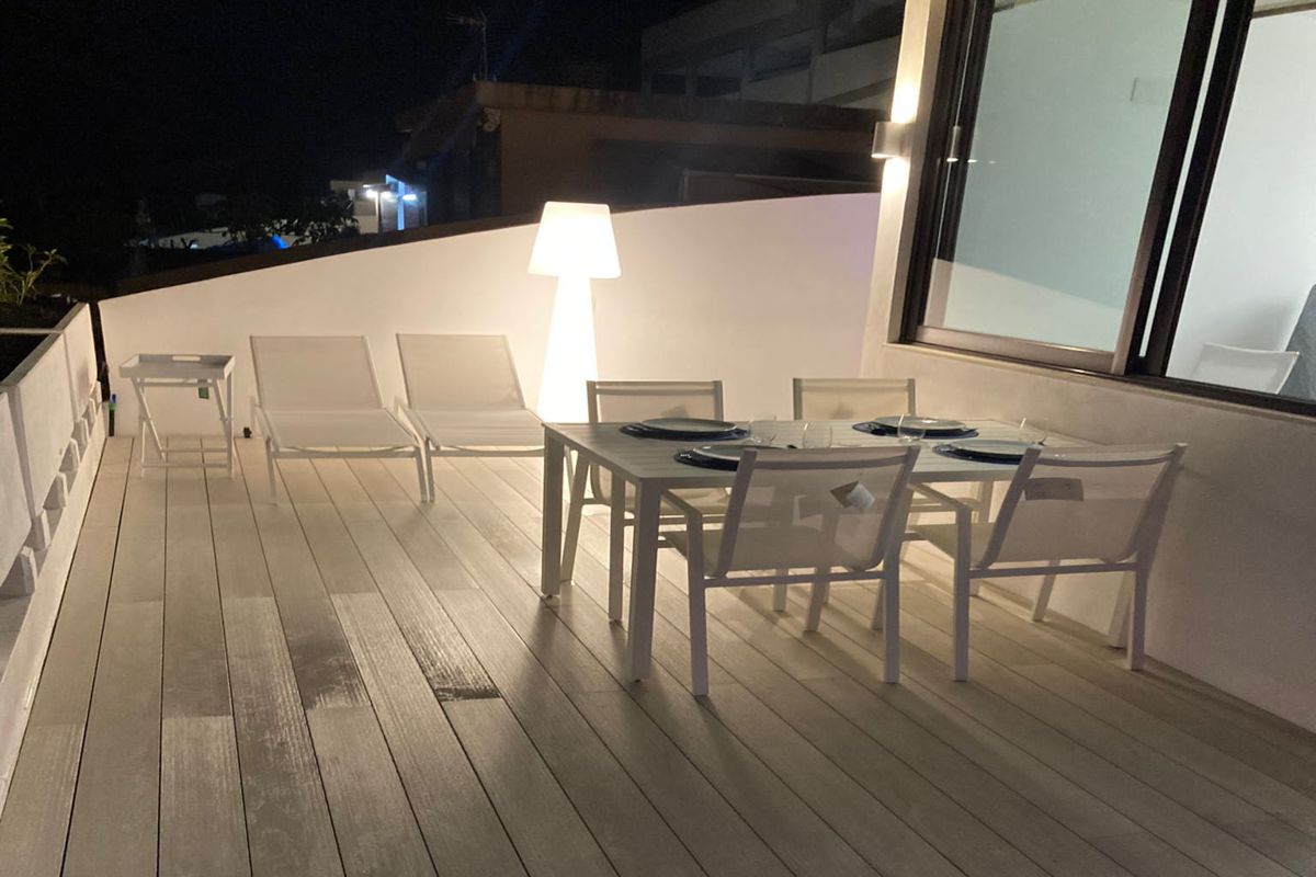 Derzeit verfügen zwei der Wohnungen über eine große Terrasse mit einer Sitzecke, Liegen, einem Esstisch für 4 Personen und einer Hydromassage-Wanne im privatesten Bereich, neben einer Außendusche. Dazu die sorgfältig ausgewählte Beleuchtung.