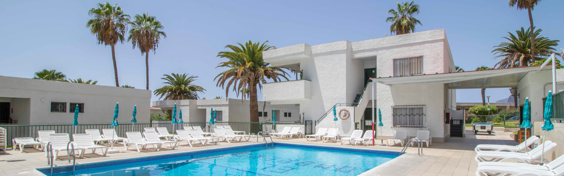 Komplex von geräumigen Appartements mit Meerblick in Los Gigantes mit Pools für Erwachsene und ein weiteres für Kinder, große Gartenbereiche.