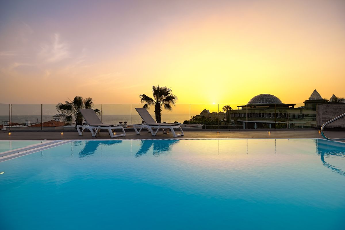 - 2 Schwimmbäder: Salzwasser mit einer Temperatur von ca. 29º, zwei geräumige Solarien, eines davon auf der Dachterrasse mit beheiztem Pool, Jacuzzi und spektakulärem Meerblick. Am Hauptpool gibt es einen Sessellift. Kostenlose Liegestühle, Sonnenschirme und Handtücher am Pool.