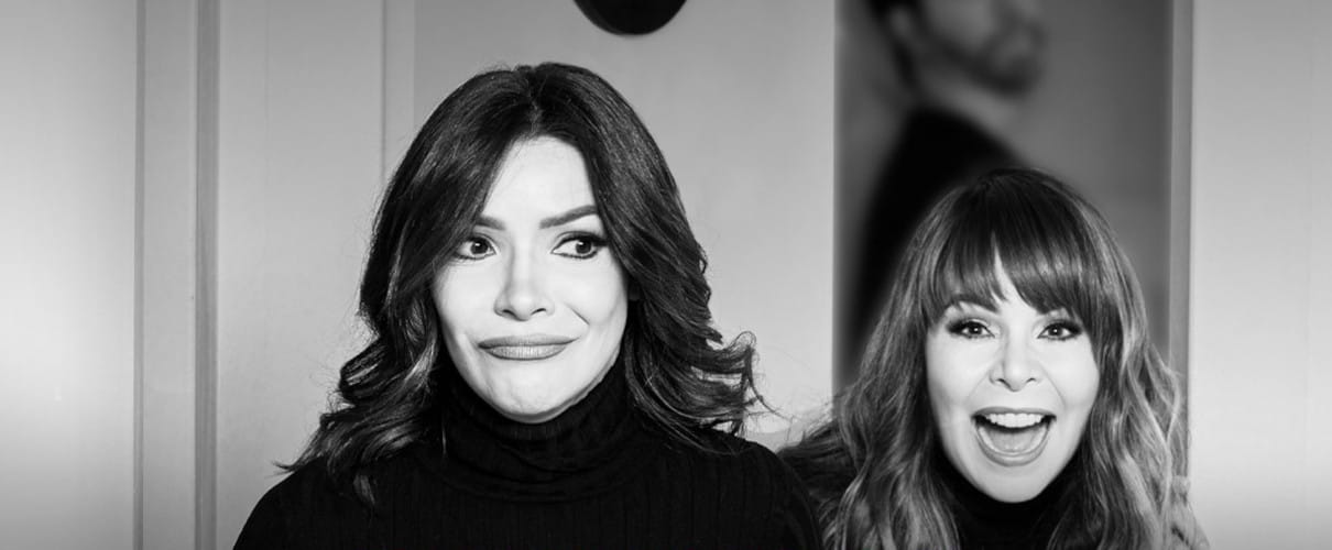 Die südamerikanischen Rundfunksprecherinnen, Moderatorinnen und Schauspielerinnen Ana María Simón und Paula Arcila präsentieren eine Bühnenvorstellung nach ihrem auf den Plattformen Instagram, Facebook, YouTube, Spotify und Ivoox veröffentlichten Podcast-Programm.